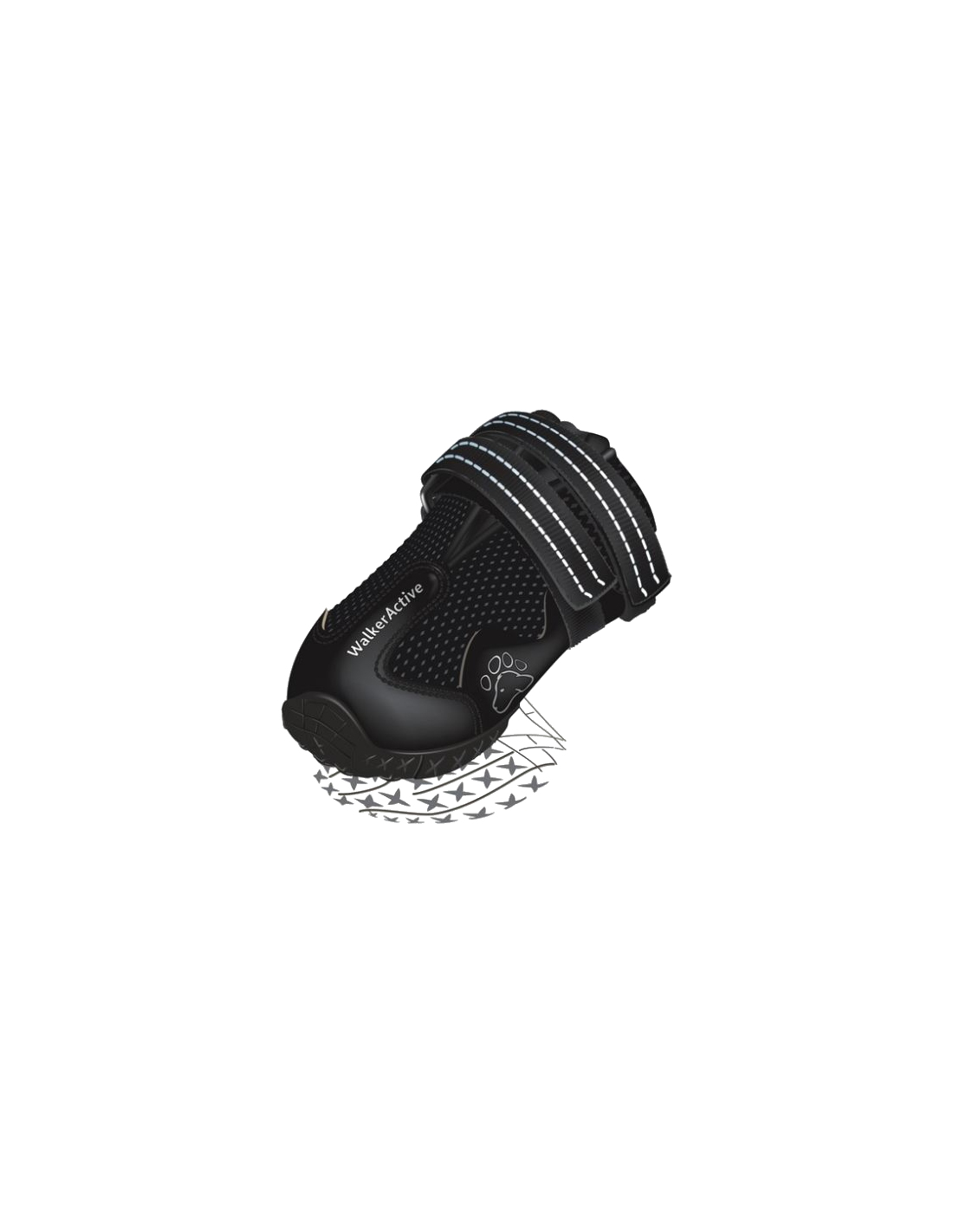 Botas para proteger las patas. Botas de suela dura y resistente, con agarre antideslizante de PVC. Ya sea en invierno si vas a la nieve de manera esporádica o habitual, a la montaña de suelo pedregoso y duro o en verano si anda por el asfalto caliente, son ideales. Las almohadillas son muy sensibles, suelen estar agrietadas o secas y tienden a sangrar, (y nunca se acaban de curar del todo), con estas botas le ayudas a cicatrizar antes, o si ha sufrido algún tipo de operación, dolencia o lesión a recuperarse. Sería perfecto también poner una crema protectora (link abajo). Se ajustan con dos tiras de velcro y son transpirables. Contenido: 2 botas color negro.